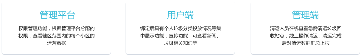 對垃圾分類進行智能化精細管理,通過平臺管理,實現綜合、完善、高效的垃圾投放、 回收及利用,各垃圾站實行全天候監控,最終實現人、事物的高效追蹤和管理。 |