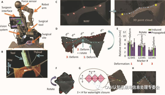 自動化是手術機器人的重要發展方向,在醫療L域由于其特殊性目前自動化的程度相對于工業、服務以及特種L域均較低。目前機器人輔助手術(RASs)的模式完全取決于單個外科醫生的手動能力。自動機器人手術可以保證手術效率和安全性的提G,并改善優化手術技術。由于技術上的限制,涉及軟組織的手術尚未d立進行,包括缺乏能夠在動態手術環境中識別和跟蹤目標組織的視覺系統,以及缺乏能夠執行復雜手術任務的智能算法。美國約翰霍普金斯大學[3]通過增強視覺、靈巧性和互補的機器智能來改善手術效果、安全性,實現軟組織變形的自動跟蹤、監測以及吻合。通過實驗證明,自主機器人可以提G手術的效率、一致性、功能結果和可行性。