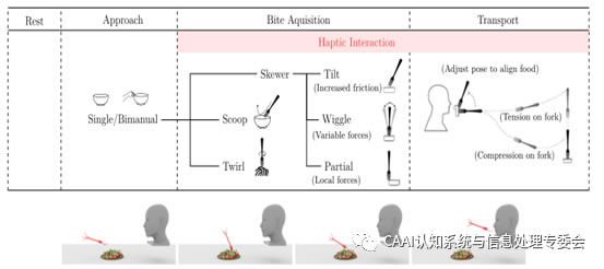 喂食是一項(xiàng)復(fù)雜的任務(wù),創(chuàng)建用于進(jìn)食的操作行為分類有助于系統(tǒng)地將其分類為子任務(wù)。通過(guò)細(xì)分,研究者們可以更好地了解人們?cè)诖巳蝿?wù)的不同階段使用的不同策略。通過(guò)將喂食任務(wù)分為四個(gè)主要階段:1)休息,2)方法,3)獲取咬痕,4)運(yùn)輸,研究者們制定了與喂食任務(wù)相關(guān)的操作策略的部分分類法(圖3)。