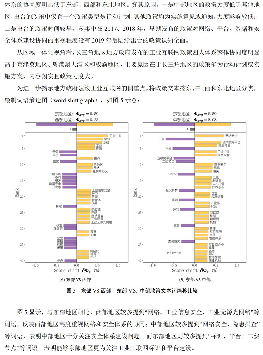 現有研究多圍繞工業互聯網架構、標準和平臺體系展開,較少分析地方政府對四大功能體系 建設的政策導向。本文一方面應用協同度算法評價地方政策體系協同水平,識別體系協同短板, 另一方面總結東、中、西和東北地區地方政策建設工業互聯網的側重點差異。
