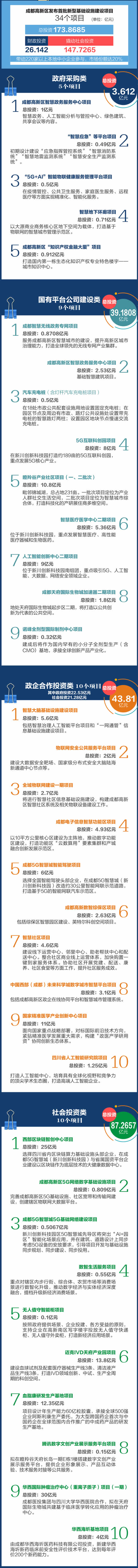 首批新基建項目總投資近180億元,其中,政府采購類項目5個、國有平臺公司建設類項目9個、政企合作投資類項目10個、社會投資類項目10個。項目中,成都5G智慧城智能駕駛項目、人工智能創(chuàng)新中心、車聯(lián)網(wǎng)智慧園等將落地成都G新區(qū)新川創(chuàng)新科技園。