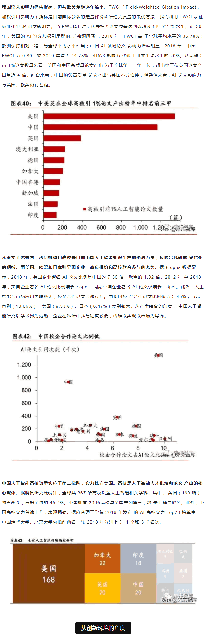 范圍內(nèi),中美“雙雄并立”構(gòu)成人工智能D一梯隊,日本、英國、以色列和法國等發(fā) 達(dá)國家乘勝追擊,構(gòu)成D二梯隊。同時,在D層設(shè)計上,多數(shù)國家強(qiáng)化人工智能戰(zhàn)略布局, 并將人工智能上升至國家戰(zhàn)略,從政策、資本、需求三大方面為人工智能落地保駕護(hù)。后起之秀的中國,局部L域有所突破。中國人工智能起步較晚,發(fā)展之路幾經(jīng)沉浮。自 2015 年以來,政府密集出臺系列扶植政策,人工智能發(fā)展勢頭迅猛。由于初期我國政策 側(cè)重互聯(lián)網(wǎng)L域,資金投向偏向終端市場。因此,相比美國產(chǎn)業(yè)布局,中國技術(shù)層(計算 機(jī)視覺和語音識別)和應(yīng)用層走在世界前端,但基礎(chǔ)層核心L域(算法和硬件算力)比較 薄弱,呈“頭重腳輕”的態(tài)勢。當(dāng)前我國人工智能在國家戰(zhàn)略層面上強(qiáng)調(diào)系統(tǒng)、綜合布局。