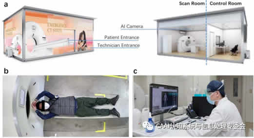 人工智能成像工作流程:許多現(xiàn)代的X光和CT系統(tǒng)都配備了用于病人監(jiān)護(hù)的攝像機(jī)。在COVID-19爆發(fā)期間,這些設(shè)備促進(jìn)了非接觸掃描工作流程的實(shí)施。技術(shù)人員可以通過攝像機(jī)的實(shí)時(shí)視頻流從控制室監(jiān)控病人。在這種情況下,人工智能能夠通過從視覺傳感器獲取的數(shù)據(jù)中識別患者的姿勢和形狀來自動(dòng)執(zhí)行操作,以確定佳掃描參數(shù)。這樣的自動(dòng)化工作流程可以顯著提G掃描效率并減少不必要的輻射暴露。一個(gè)顯著的例子是基于由可視人工智能技術(shù)支持的移動(dòng)CT平臺自動(dòng)掃描工作流,如圖1(a)所示。移動(dòng)平臺完全獨(dú)立,帶有基于人工智能的預(yù)掃描和診斷系統(tǒng)。它被重新設(shè)計(jì)成一個(gè)完全隔離的掃描室和控制室,以避免技術(shù)人員和患者之間不必要的互動(dòng)。進(jìn)入掃描室后,通過視覺和聽覺提示,指示患者在病床上擺好姿勢(圖1(b))。技術(shù)人員可以通過窗戶觀察,也可以通過掃描室內(nèi)安裝在天花板上的人工智能攝像機(jī)傳輸?shù)膶?shí)時(shí)視頻,并在必要時(shí)校正病人的姿勢(圖1(c))。患者定位算法將從用照相機(jī)[1]捕獲的圖像中自動(dòng)恢復(fù)患者的3D姿態(tài)和完全重建的網(wǎng)格。基于3D網(wǎng)格,患者目標(biāo)身體部分的掃描范圍和3D中心線都被估計(jì)并轉(zhuǎn)換成控制信號和優(yōu)化的掃描參數(shù),以供技術(shù)人員驗(yàn)證。一旦核實(shí),病床將自動(dòng)對準(zhǔn)ISO中心,并移入掃描架進(jìn)行掃描。采集到CT圖像后,將對其進(jìn)行處理和分析,以便進(jìn)行篩查和診斷。2、AI圖像增強(qiáng)在COVID-19中的具體應(yīng)用