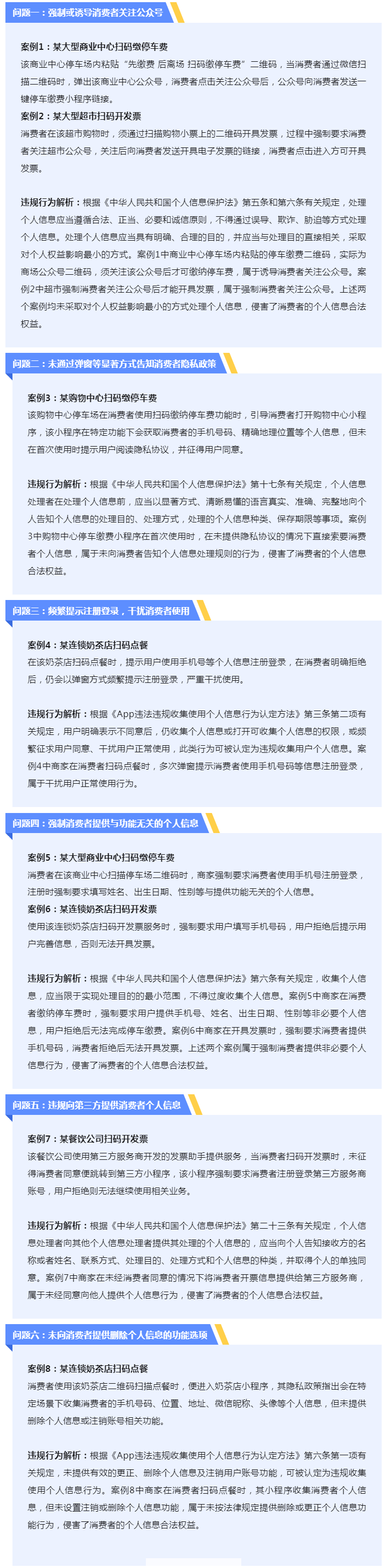 為進(jìn)一步規(guī)范我市掃碼消費(fèi)服務(wù)經(jīng)營(yíng)行為,切實(shí)保護(hù)消費(fèi)者個(gè)人信息合法權(quán)益,綜合對(duì)我市提供掃碼消費(fèi)服務(wù)二維碼抽樣測(cè)試情況,對(duì)六類(lèi)常見(jiàn)易發(fā)違規(guī)問(wèn)題進(jìn)行案例解析,根據(jù)《中華人民共和國(guó)個(gè)人信息保護(hù)法》《App違法違規(guī)收集使用個(gè)人信息行為認(rèn)定方法》等法律法規(guī),提出六條合規(guī)指引,供全市提供掃碼消費(fèi)服務(wù)的經(jīng)營(yíng)者遵照?qǐng)?zhí)行。