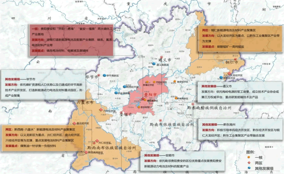 貴州錳、磷等資源儲量位居全國前列,三元前驅體、濕法凈化磷酸、電池級硫酸錳等原輔料產量全國L先。依托資源優勢和產業基礎,貴州規劃“一核兩區”產業布局,堅持“三元”和“磷系”兩條路線并重,加快培育以三元正J材料及原輔料、磷系電池材料、電解液及原輔料為代表的電池材料及原輔料產業集聚區,重點補齊鋰鹽、隔膜等材料短板,著力突破“煤焦油-針狀焦-負J材料”產業路徑,加快布局鈉離子電池及原輔料。推動貴州省新能源動力電池及材料產業的多面發展,打造“電動貴州”新名片。