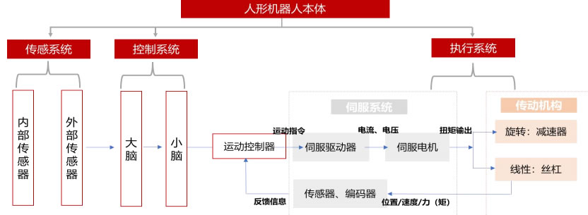 三、執(zhí)行系統(tǒng)對應(yīng)“肢體”,負責(zé)執(zhí)行控制系統(tǒng)制定的操作。“機器肢”指仿人機械臂、靈 巧手、腿足等,“機器體”指骨骼、本體結(jié)構(gòu)等。執(zhí)行系統(tǒng)的工作流程如下圖所示,涉及到伺服系統(tǒng)和執(zhí)行機構(gòu):伺服系統(tǒng)是能根據(jù)指令信號準確地控制執(zhí)行部件的運動速度與位置的驅(qū)動 系統(tǒng),一般伺服系統(tǒng)由核心零部件電機、驅(qū)動器和傳感器/編碼器組成;傳動機構(gòu)是把動力從 機器的一部分傳遞到另一部分,實現(xiàn)改變動力機輸出轉(zhuǎn)矩或者改變其運動方式(旋轉(zhuǎn)運功和直 線運動的轉(zhuǎn)換),機械傳動分為兩類,一是靠機件間的摩擦力傳遞動力與摩擦傳動,二是靠主 動件與從動件嚙合或借助中間件嚙合傳遞動力或運動的嚙合傳動,典型機構(gòu)有減速器、絲杠、 蝸輪蝸桿傳動桿等。