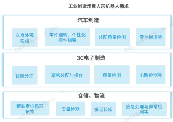 工業(yè)制造場景因其單—性和重復(fù)性特點(diǎn),是人形機(jī)器人應(yīng)用易實現(xiàn)落地的場景, 并終過渡至C端場景中。