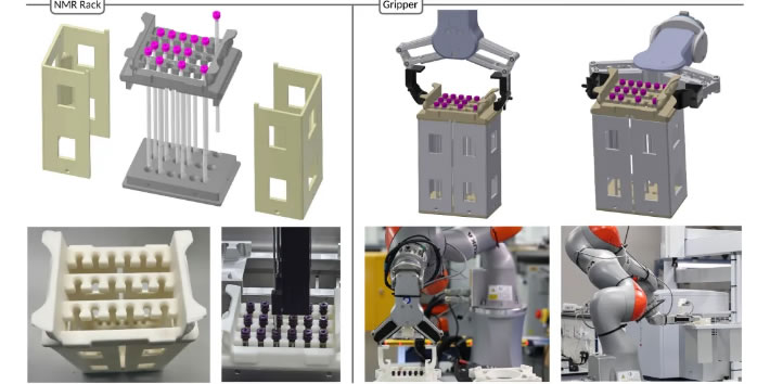 用于移動 agent 處理的定制核磁共振機架。左圖:組裝好的機架預先裝有核磁共振管,并放置在 ISynth 平臺內,然后液體輸送工具將液體分配到管子中,管子有帶孔的蓋子,以便分配。右圖:NMR-Agent 使用定制的指尖,使其能夠垂直和水平地抓握和移動機架。垂直握把方向用于從 ISynth 甲板上取下機架,水平握把方向用于將機架移入臺式核磁共振自動采樣器。