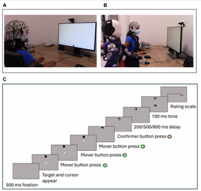 在這項研究中,科學家們使用了時間間隔估計任務(如圖2)和腦電圖(EEG)(如圖3)來評估人們在與機器人合作時是否能感受到共同代理感(Sense of Joint Agency, SoJA),以及這種感覺是否受到人們對機器人意圖歸因的影響。