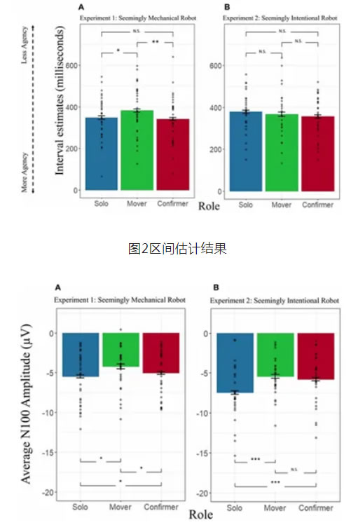 b.ERP分析:即使在solo角色中N100波幅仍然大,但在confirmer和mover角色之間沒有顯著差異。這表明,當參與者認為機器人有意圖時,他們對機器人行動產(chǎn)生的聽覺結(jié)果的神經(jīng)反應與自己行動產(chǎn)生的結(jié)果類似,這支持了SoJA形成的觀點。