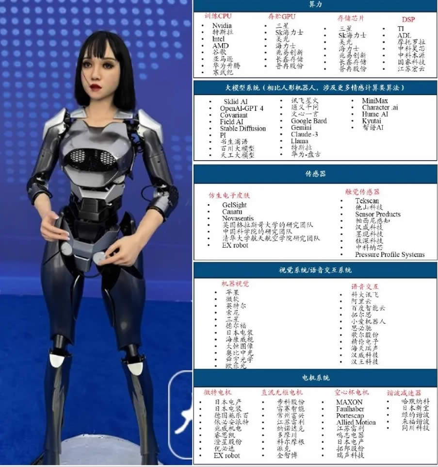 外觀設計:3D打印骨骼與硅膠仿真皮技術使機器人外表和觸感都接近 真人;柔性關節(jié)技術,滿足人形機器人小型化、參數(shù)可定制、大扭矩等特殊 需求,提升了機器人動作的柔順度。