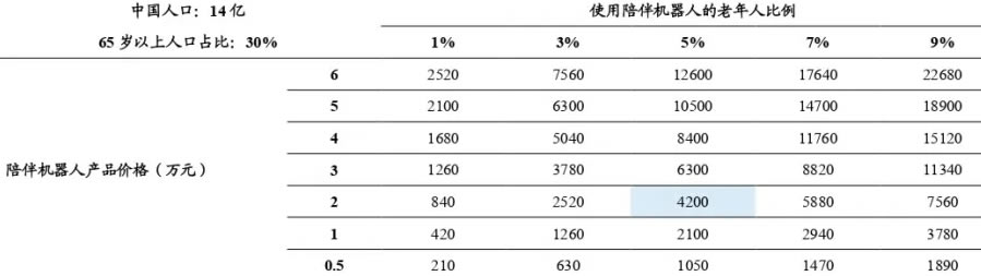 陪伴機器人在中國老年人群中的潛在市場需求為4200億人民幣。 核心假設: