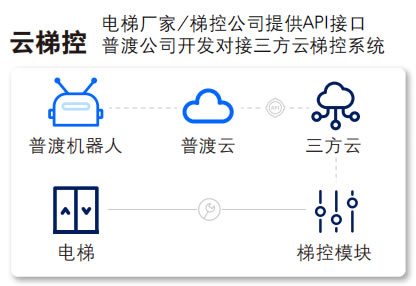 云梯控通過云端API接口與電梯控制系統(tǒng)進行 數(shù)據(jù)交互。服務(wù)機器人可以通過網(wǎng)絡(luò)訪問電 梯操作系統(tǒng),而無需對電梯進行任何硬件改 造。這一過程依賴于云計算平臺的實時處理 和數(shù)據(jù)分析能力。云梯控的優(yōu)勢在于不需要 改造電梯,通過API接口實現(xiàn)機器人乘梯;兼 容性G,可以供不同類型的服務(wù)機器人在同 一個場景共同乘梯 ;功能實現(xiàn)靈活,可通過 電梯接口去實現(xiàn)不同乘梯需求。