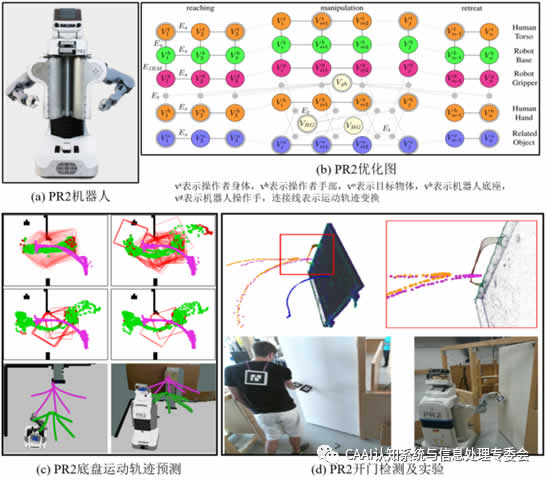 Personal Robot 2(PR2)[5]是Willow Garage開發的移動式操作機器人平臺(如圖2(a)),它配備兩個兼容7自由度機械臂和機械手,在頭部、胸部、肘部、夾爪上分別安裝有G分辨率攝像頭、激光測距儀、慣性測量單元、觸覺傳感器等豐富的傳感設備,通過底部的四輪移動平臺可無限擴展其作業范圍,提供基于Ros系統的仿真環境,可模擬開門、打臺球和畫畫等復雜操作,適用于科研的實驗平臺。Welschehold[6]在PR2實現了從人的開門操作動作示教中學習移動底盤的運動方式以及夾持器的操作姿態,作者將機器人的學習分為三個部分的軌跡預測包括示教者的手部運動軌跡、示教者的身體移動軌跡以及被操作物體的運動軌跡,后通過超圖優化方式的來預測機器人底盤運動和操作機械臂的運動軌跡(如圖2(b)-(d))。