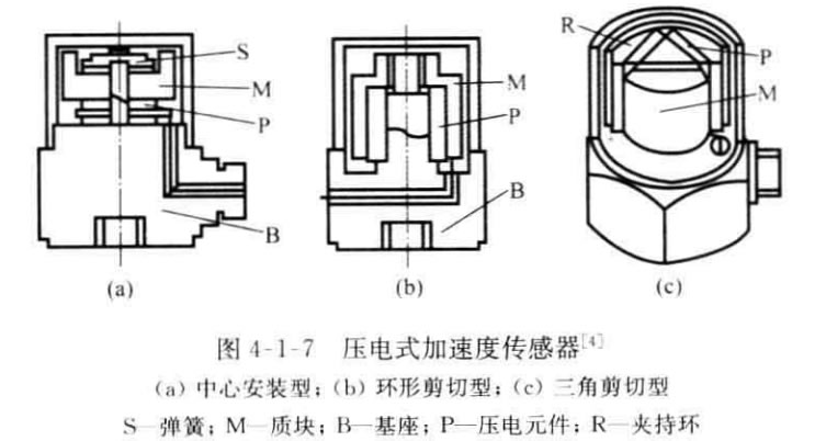 常用的壓電式加速度計(jì)的結(jié)構(gòu)形式如圖4-1-7所示。圖中(a) 是安裝壓 縮型,壓電元件 一質(zhì)量塊 一 彈簧系統(tǒng)裝在圓形中心支柱上,支柱與基座連接。這種 結(jié)構(gòu)有高的共振頻率。然而基座B 與測試對(duì)象連接時(shí),如果基座 B 有變形則將直 接影響拾振器輸出。此外,測試對(duì)象和環(huán)境溫度變化將影響壓電元件,并使預(yù)緊力 發(fā)生變化,易引起溫度漂移。圖(c) 為三角剪切形,壓電元件由夾持環(huán)將其夾牢在 三角形中心柱上。加速度計(jì)感受軸向振動(dòng)時(shí),壓電元件承受切應(yīng)力。這種結(jié)構(gòu)對(duì) 底座變形和溫度變化有極好的隔離作用,有較高的共振頻率和良好的線性。圖(b) 為環(huán)形剪切型,結(jié)構(gòu)簡單,能做成極小型、高共振頻率的加速度計(jì),環(huán)形質(zhì)量塊粘到 裝在中心支柱上的環(huán)形壓電元件上。由于粘結(jié)劑會(huì)隨溫度增高而變軟,因此Z高 工作溫度受到限制。