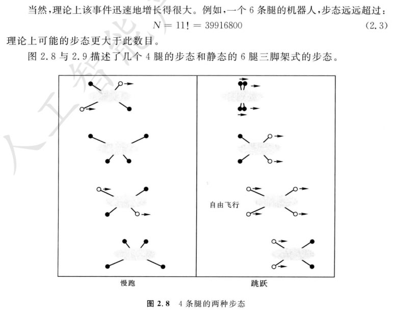 因為腿式機器人的發明是受到生物學上的啟發,所以檢驗一下生物學上成功的 有腿系統是有益的。許多不同的腿的構造已經在各種各樣的生物體中成功地存在 (圖2.6)。大型動物,如哺乳動物和爬行動物有4條腿,而昆蟲有6條腿或更多。某 些哺乳動物,僅靠2條腿行走的能力已經很出色。尤其是人類,平衡能力已經進展到 甚至可用單腿進行跳躍的水平①。這種異常的機動性是以很高代價得來的:為保持平 衡而使用更復雜的主動控制 。