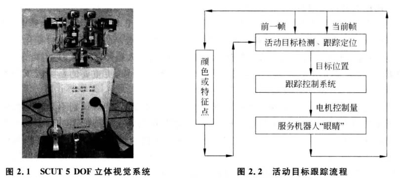 圖2.1所示的服務機器人“眼睛”是一個5 DOF 立體視覺系統,它能夠跟蹤和識別活 動的目標。它是由 SCUT “智能計算機”科研團隊研制成功的。該“眼睛”包括兩個彩色 攝像機、圖像處理板、個人電腦、數據采集卡、5個直流電機、直流電機驅動器。考慮到主 動跟蹤和目標特征與速度和魯棒性等要求,該“眼睛”以基于顏色的跟蹤算法為基礎,結 合目標特征跟蹤及目標運動預測等就可以對活動目標進行跟蹤和識別。