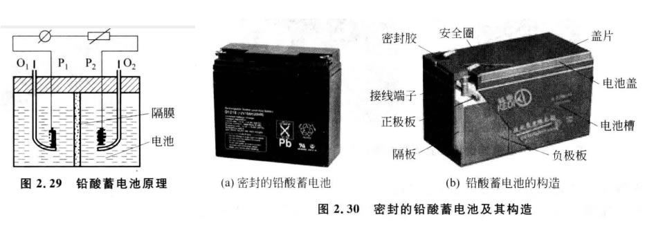 1859年,法國人普蘭特發明了鉛酸蓄電池,至今已有 150多年的發展歷程。鉛酸蓄電池在理論研究、產品種類 及品種、產品電氣性能等方面都得到了長足的進步,在交 通、通信、電力、軍事、航海、航空等各個領域,鉛酸蓄電池都 起到了不可缺少的重要作用。鉛酸蓄電池的原理和構造如 圖2.29和圖2.30所示,它是一種電極由鉛及其氧化物制成,電解液是硫酸溶液的蓄電池。鉛酸蓄電池在荷電狀態下,正極的主要成分是二氧化 鉛,負極主要成分為鉛。在放電狀態下,正負極的主要成分均為硫酸鉛。