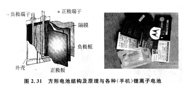 鋰電池是指電化學體系中含有鋰(包括金屬鋰、鋰合金、鋰離子、鋰聚合物),由鋰金 屬或鋰合金為負極材料、使用非水電解質溶液的電池。鋰電池大致分為鋰金屬電池和鋰 離子電池兩類。鋰金屬電池內含金屬態鋰,它通常是不可充電的。鋰離子電池不含有金 屬態鋰,它可以充電。Z早出現的鋰電池來自于偉大的發明家愛迪生,他使用了反應 Li+MnO₂=LiMnO₂ 。 該反應為氧化還原反應和放電。由于鋰金屬的化學特性非; 潑,使得鋰金屬的加工和保存及使用對環境要求非常高,所以鋰電池長期沒有得到廣泛 應用。但是,鋰電池現在已經成為了主流,如圖2.31所示。鋰離子電池中因為不含有重 金屬鎘,與鎳鎘電池相比較,它可以大大減少對環境的污染。
