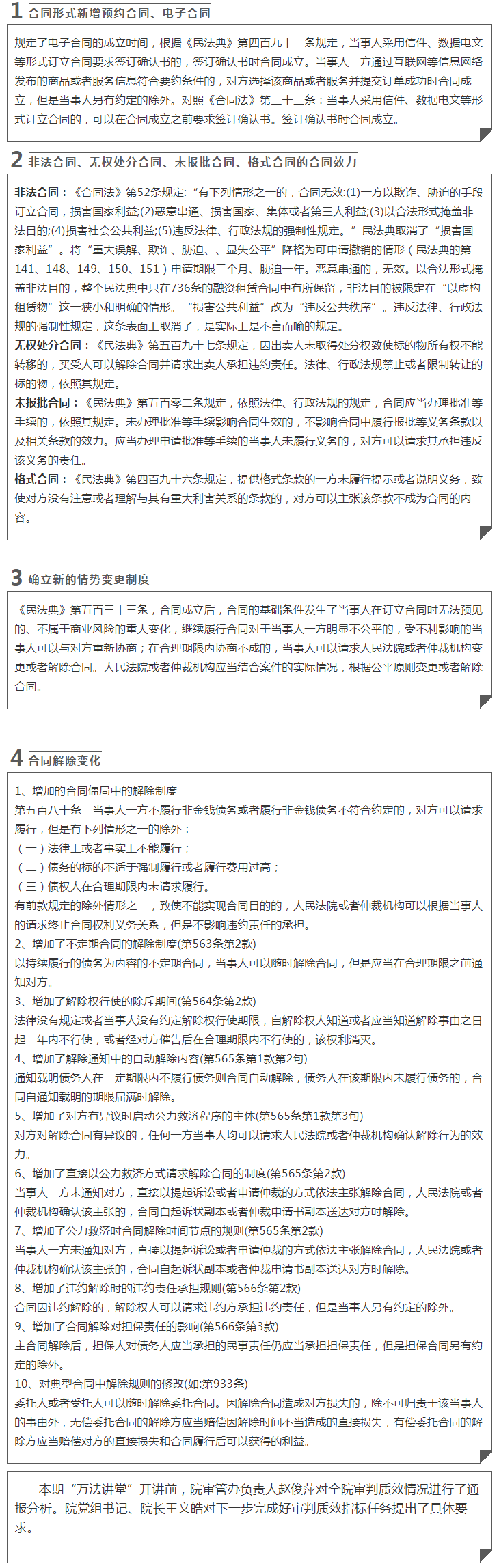 法官助理李洋通過對比民法典《合同編》與現行《中華人民共和國合同法》等新舊法律條文,解讀了《民法典》編纂中對原《合同法》訂立規則相關法條的完善和創新之處,并歸納總結出九大重大變化,為參會人員理解民法典合同編內容提供了理論支撐和觀點參考。