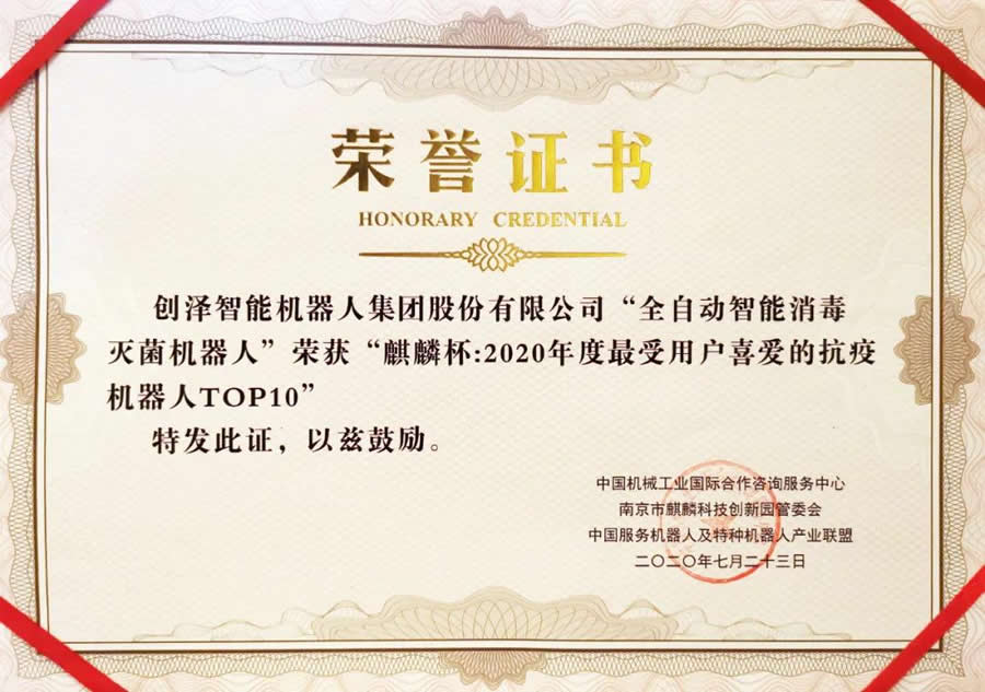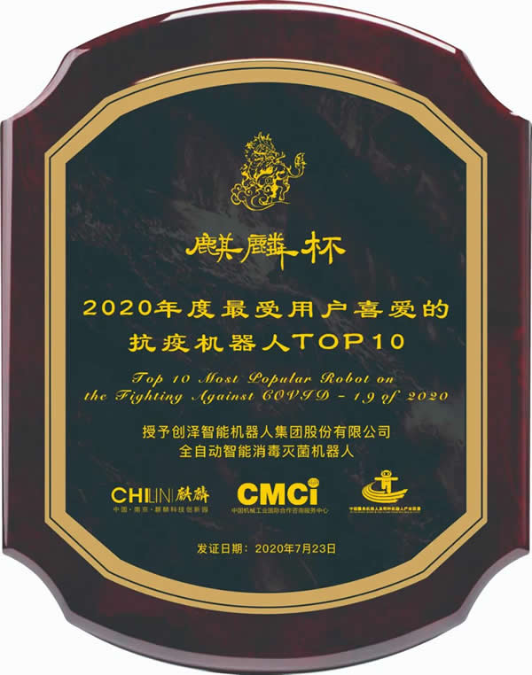 2020年7月23日,由中國機械工業(yè)國際合作咨詢服務中心、南京麒麟科創(chuàng)園管委會、中國服務機器人及特種機器人產(chǎn)業(yè)聯(lián)盟聯(lián)合主辦的2020第六屆國際服務機器人產(chǎn)業(yè)G峰論壇暨“第三屆麒麟杯頒獎典禮在南京舉行。此次典禮上,中國智能服務機器人L軍企業(yè)創(chuàng)澤集團被授予“麒麟杯:2020年度受用戶喜愛的抗疫機器人TOP10”榮譽證書。