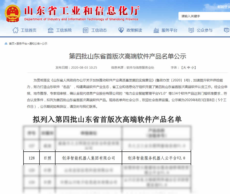 近日,省工業和信息化廳發布《山東省首版次G端軟件(第四批)公示名單》,創澤集團自主研發的“創澤智能服務機器人云平臺V2.0”等軟件產品成功入選。截至目前,創澤集團共有多款產品榮獲山東省首版次G端軟件產品。