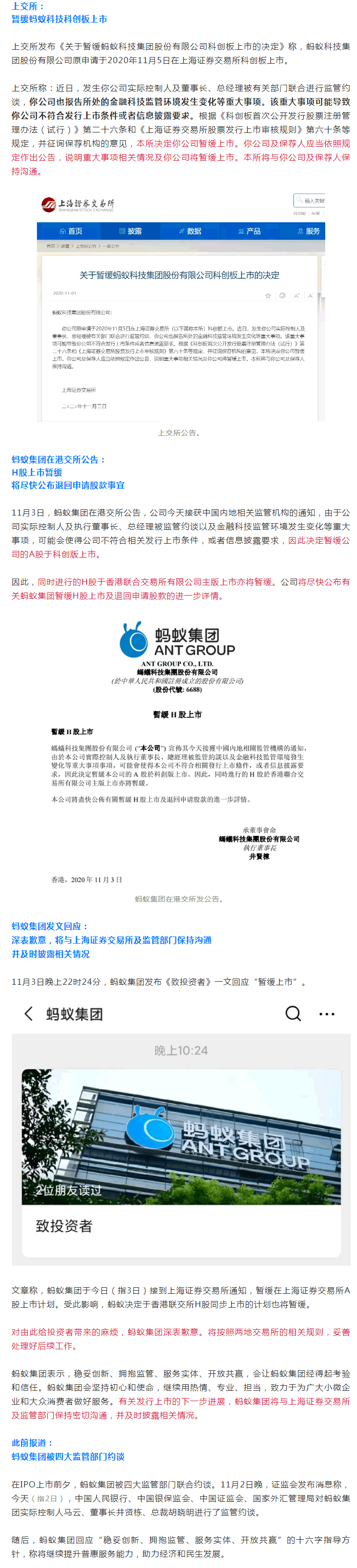 11月3日晚間,上交所公告稱,暫緩螞蟻科技集團股份有限公司科創(chuàng)板上市。隨后,螞蟻集團在港交所發(fā)布公告,同時進行的H股于香港聯(lián)合交易所有限公司主版上市亦將暫緩。