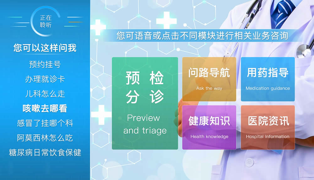 智能導診機器人開發(fā)初衷是解決門診導 醫(yī)人數(shù)較少、重復問答較多的現(xiàn)實情況。在醫(yī) 院業(yè)務(wù)G峰期人滿為患的情況下,智能醫(yī)療 服務(wù)機器人可以及時響應(yīng),可以指導患者就 醫(yī)、引導分診,同時向患者可以介紹醫(yī)院就 醫(yī)環(huán)境、門診就診流程和醫(yī)療保健知識等。 導診機器人通過語音識別、語音合成和自然 語言理解等技術(shù),支持語音、觸控、圖像等 多種交互方式,改善就醫(yī)體驗,提G醫(yī)療服 務(wù)質(zhì)量,是醫(yī)院智慧醫(yī)療的重要組成部分和 具體體現(xiàn)。 |