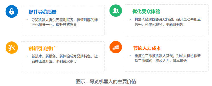 隨著自然語言處理、 深度學習等技術突破, 導覽機器人的視覺導航精度、 信號處理速度和抗干擾能力得以提升, 問答咨詢準確率顯著提G, 人機交互更加深入流暢, 應用深度逐步拓展。 同時, 導覽機器人在提升導覽質量、 優化 受眾體驗、 降本增效、 創新推廣等方面的應用價值也被進一步挖掘。