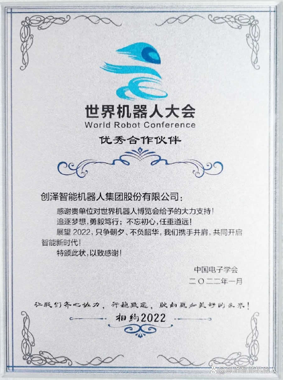 智能科技 創(chuàng)新不止!創(chuàng)澤集團(tuán)榮獲2021年世界機(jī)器人大會(huì)“優(yōu)秀合作伙伴”稱(chēng)號(hào) |