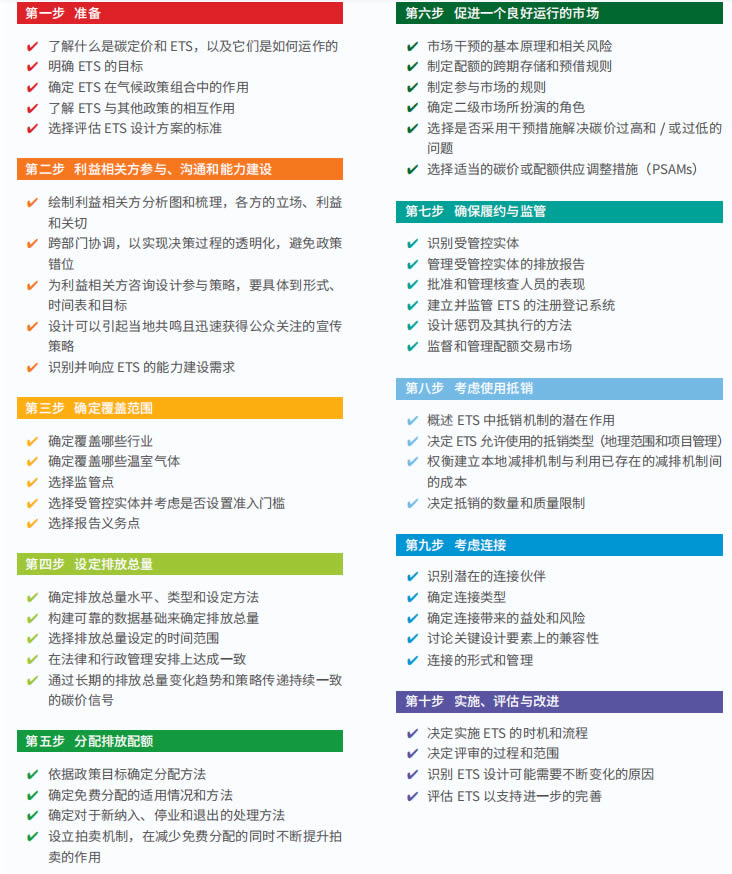 這些步驟之間相互依存,每一步所作的選擇都將對其他步驟的決策產(chǎn)生重要影響。在實踐中,ETS 的設(shè)計過程是“迭代”而 非“線性”的。2016 年初版手冊發(fā)布之后,隨著 ETS 在各個 國家和地區(qū)的發(fā)展,很多新見解、新方法和新設(shè)計思路都影響著 ETS 的運行方式,也進(jìn)一步加深了我們對于 ETS 的理解和認(rèn)識。所有這些新內(nèi)容我們都在本手冊的相關(guān)章節(jié)中予以更新。