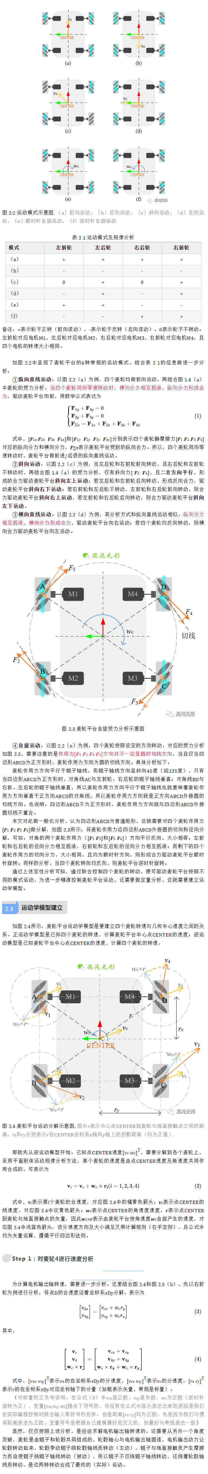 要滿足上述的分力能夠相互抵消的條件是麥輪(或電機)轉速大小相同,因為每個麥輪受到的地面支持力相同(基于假設①②),4個電機又勻速等速轉動,意味著電機輸出扭矩與地面作用于麥輪的摩擦力是平衡的,4個麥輪摩擦力在輪轂軸向和徑向上分解的大小是相同的,而速度分解與力分解類似,所以4個麥輪沿輪轂軸向和徑向的分速度大小是相同的。