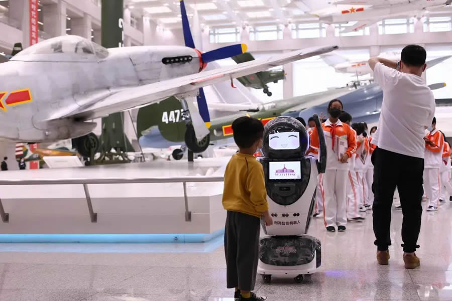 創(chuàng)澤博物館服務(wù)機(jī)器人“創(chuàng)創(chuàng)”亮相中國人民革命軍事博物館,每天為觀眾提供軍事科普講解、信息查詢等服務(wù)。除了常規(guī)的語音介紹,機(jī)器人還能隨機(jī)播放館藏戰(zhàn)機(jī)重要?dú)v史時(shí)刻的音視頻畫面,呈現(xiàn)出集聲音畫面于一體全景式講解。