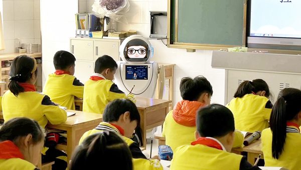 學校智能教育機器人正在課堂上與學生們一起上課。