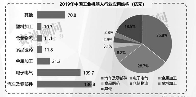 2019年,汽車及零部件在中國工業機器人市場的行業應用占比為35.8%;電子電氣占比為28.7%;金屬加工占比8.2%;食品醫藥占比3.1%;倉儲物流占比2.9%;塑料加工占比 2.8%;其它L域占比18.5%。